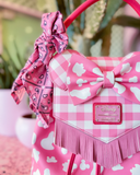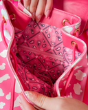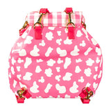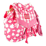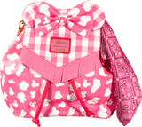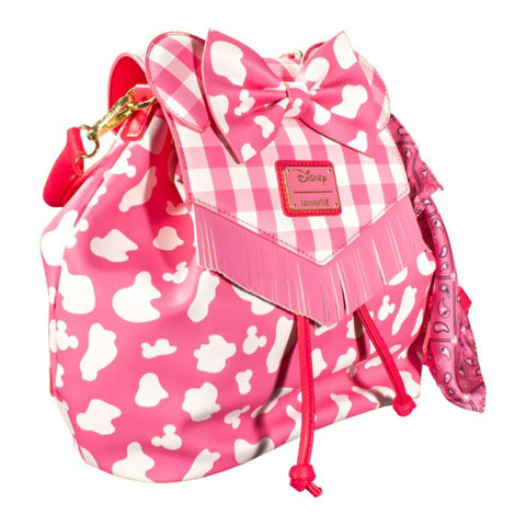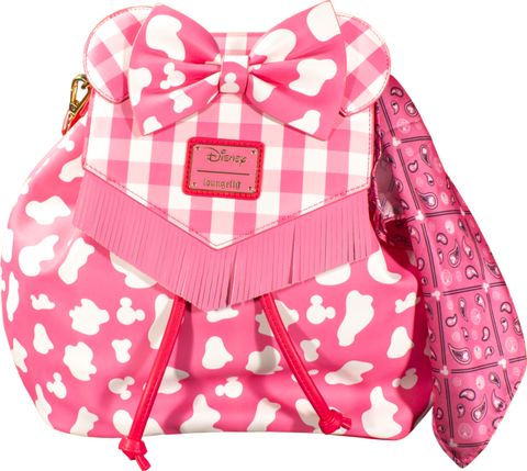 This gorgeous pink and white accessory can be worn as both a backpack and crossbody bag! Not only that, a detachable paisley handkerchief is also included! With both gingham and cow prints, this bag is the cutest in the west. Minnie’s signature hair bow tops off the bag amid applique ears and the look is completed with Loungefly’s enamel plaque. Bag features a cinch closure and a magnetic button underneath the fringe-lined flap.