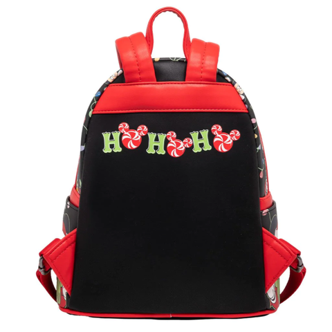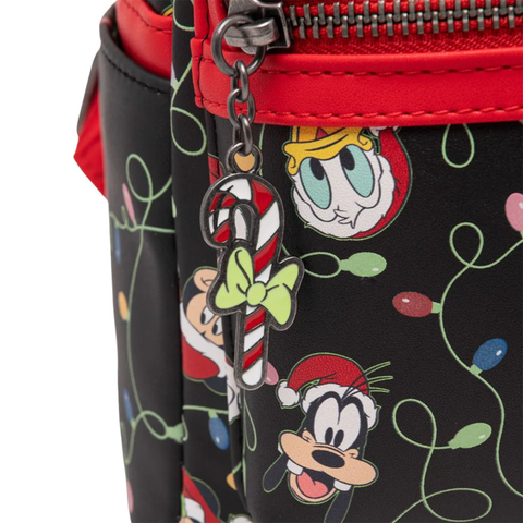 This festive all-over print features Mickey, Minnie, Goofy, Donald and Pluto wearing Santa hats in a maze of Christmas lights. In the dark, the lights even glow! Vegan-friendly leather coloured black perfectly compliments the colorful print, while a bold red frames the look as the bag’s borders, piping, carry handle and shoulder straps. With two side pockets, a front zipper compartment with an enamel zipper charm and silver-tone hardware, this accessory is perfect for fans to add some festive Disney flair to any outfit!