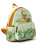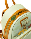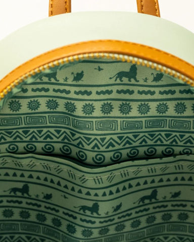 Inspired by the tropical oasis home of Timon and Pumbaa, this design features lush ferns and flowers adorning a beautiful green palette. Rafiki can be seen on the front pocket amongst the foliage, while Zazu flies above. The bag’s zipper charm is made in the shape of a monstera deliciosa - a plant that can grow sweet fruit in the right conditions. At the front and center of the backpack, Simba, Pumbaa and Timon are walking in a line, just like the log-crossing scene that sees Simba grow into an adult. On the back, as green linework, you’ll see Simba having taken his place as king as he stands atop Pride Rock.