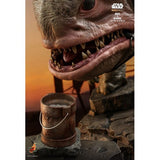 Kuiil is accompanied by the highly accurate Blurrg figure, which stands at approximately 14.56” tall by 23.6” long, featuring a detailed head and body with excellent detail and colouration on mouth, teeth, tail, and rough texture of the skin, as well as articulated arms, a saddle, and a rocky theme display stand.